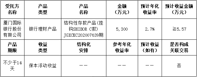 委托理財產(chǎn)品名稱:結構性存款產(chǎn)品(掛鉤SHIBOR C款)JGXCKC202007639期。