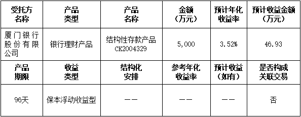 本次委托理財(cái)金額:委托廈門銀行理財(cái)5,000萬(wàn)元。
