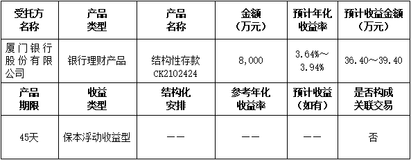 ?本次委托理財(cái)金額:委托廈門(mén)銀行理財(cái)8,000萬(wàn)元。