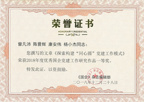 近日,《國企》雜志編輯部依據(jù)文章主題、文字闡述等質(zhì)量評審要素,對刊載于2018年度《國企·黨建》雜志的文章進(jìn)行評審,按黨建理論研究、工作研究、宣傳報道3大類評選出108篇優(yōu)秀作品。由公司黨委書記、董事長曾凡沛主持撰寫的《探索構(gòu)建“同心圓”黨建工作模式》榮獲2018年度優(yōu)秀國企黨建工作研究作品一等獎。