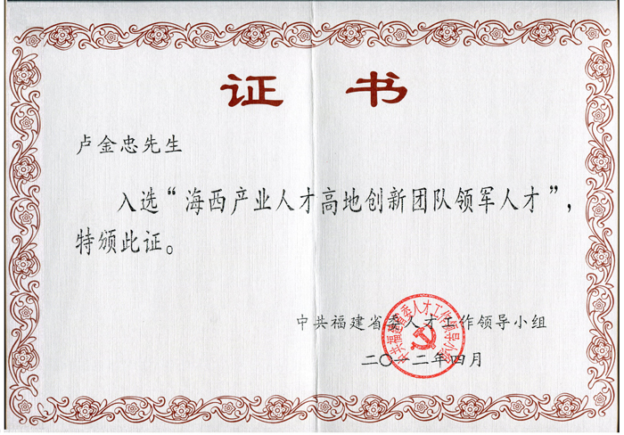 海西產(chǎn)業(yè)人才高地 創(chuàng)新團(tuán)隊(duì)領(lǐng)軍人才(盧金忠)證