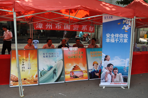 按照《漳州市人民政府安全生產委員會辦公室關于做好安全生產宣傳咨詢日活動的通知》精神,6月9日早上,我公司代表國資系統參加漳州市2013年安全生產宣傳咨詢日活動,在市區延安北路繁華路段設置咨詢點,舉行安全生產知識咨詢活動。主要活動內容有:分發安全生產宣傳資料;安全生產知識咨詢;謎語競猜;安全月主題展等。