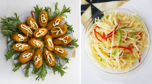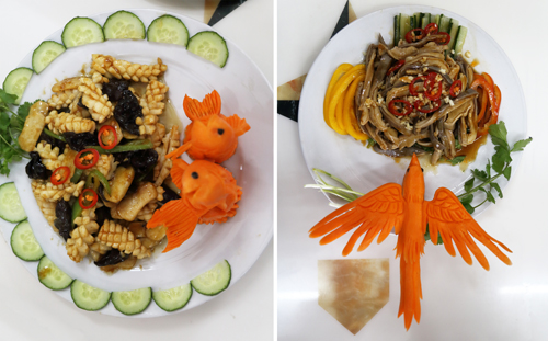 參賽隊員們自帶食材,各顯其能,動作嫻熟,有條不紊,盡顯烹飪能手的風采。十八支參賽隊共烹飪出了18道熱菜和18道冷菜的美味佳肴,他們還為每個菜品起了生動的名字,寓意不同,“荷荷美美”寓意家庭和美幸福;“魚躍龍門”彰顯著對職工、對企業的美好祝愿;“多彩人生”承載著每個職工對工作生活期盼。不僅創意新穎,而且色澤鮮美,味道純正,女工們用自己精心烹飪的美味佳肴互傳友誼,倡導和諧健康生活。